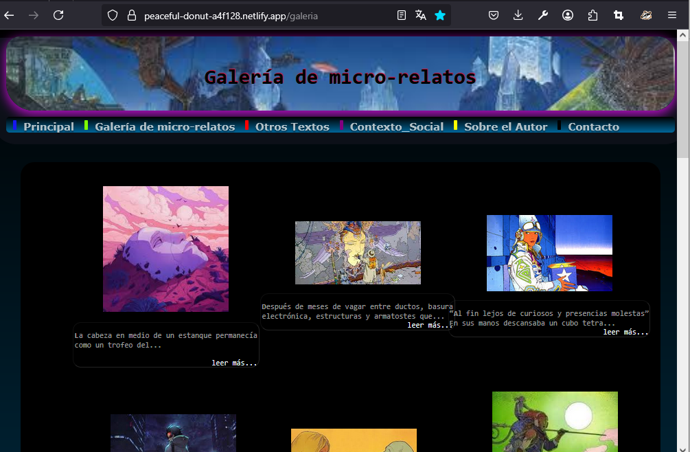 Aquí dejo una web personal que elaboré (en dos tres días) una semana antes de una crisis y donde dejo una serie de historias. Un dato interesante es que toda la web la hice en HTML, JavaScript y CSS3 sin ninguna librería y que quedó inconclusa, pues el código descansaba en una máquina que murió pos crisis y no tenía respaldo alguno en la web en ese momento(igual estoy seguro disfrutaran las historias y textos incluidos):https://peaceful-donut-a4f128.netlify.app/galeria